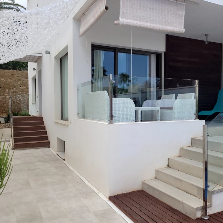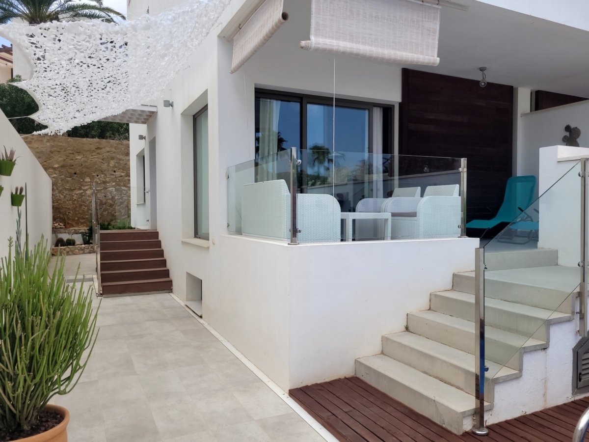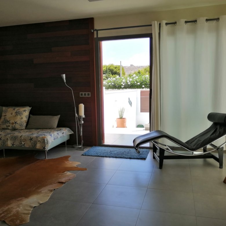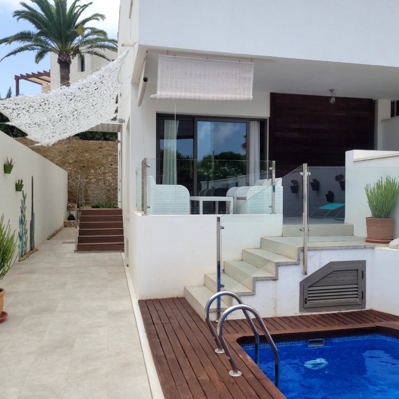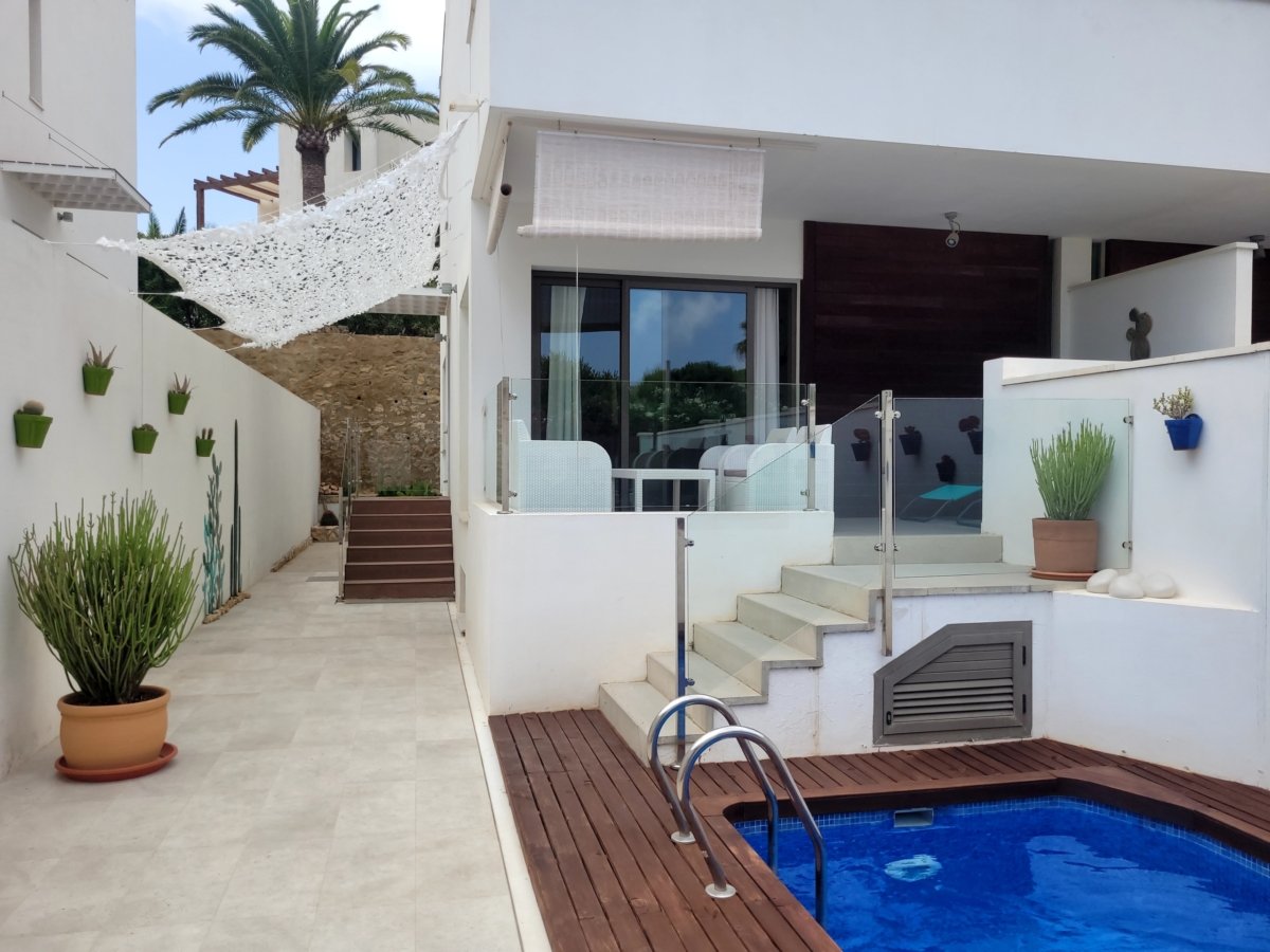 Cuenta con una pequeña piscina propia que brinda la oportunidad de refrescarse y disfrutar de momentos de relax en cualquier momento del día, así como una terraza con zona de estar y tumbonas para poder disfrutar al aire libre. La casa en sí es cómoda y moderna, con un diseño pensado para ofrecer una estancia agradable. Sus espacios interiores están bien distribuidos y amueblados con gusto, proporcionando comodidad y funcionalidad.